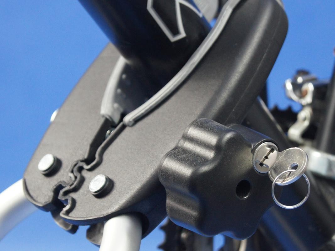 Gałka z zamkiem do standardowego uchwytu z zaciskiem śrubowym. Zabezpiecza rower przed kradzieżą.